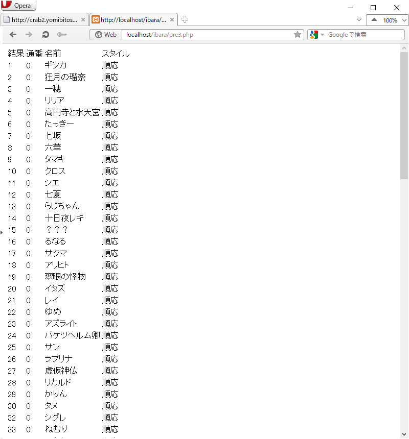 print_r($outa1);やecho $outa1[1][0];で確認したように、PC側のキャラクター名は$outa1[1]の引き出しの中に入っていきます。