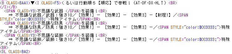 ⇒と<BR>で囲まれた範囲を更に切り取り、そこから/と:の間、或いは強さと/の間を切り取れば、武器の種類と強さは切り取れる!
