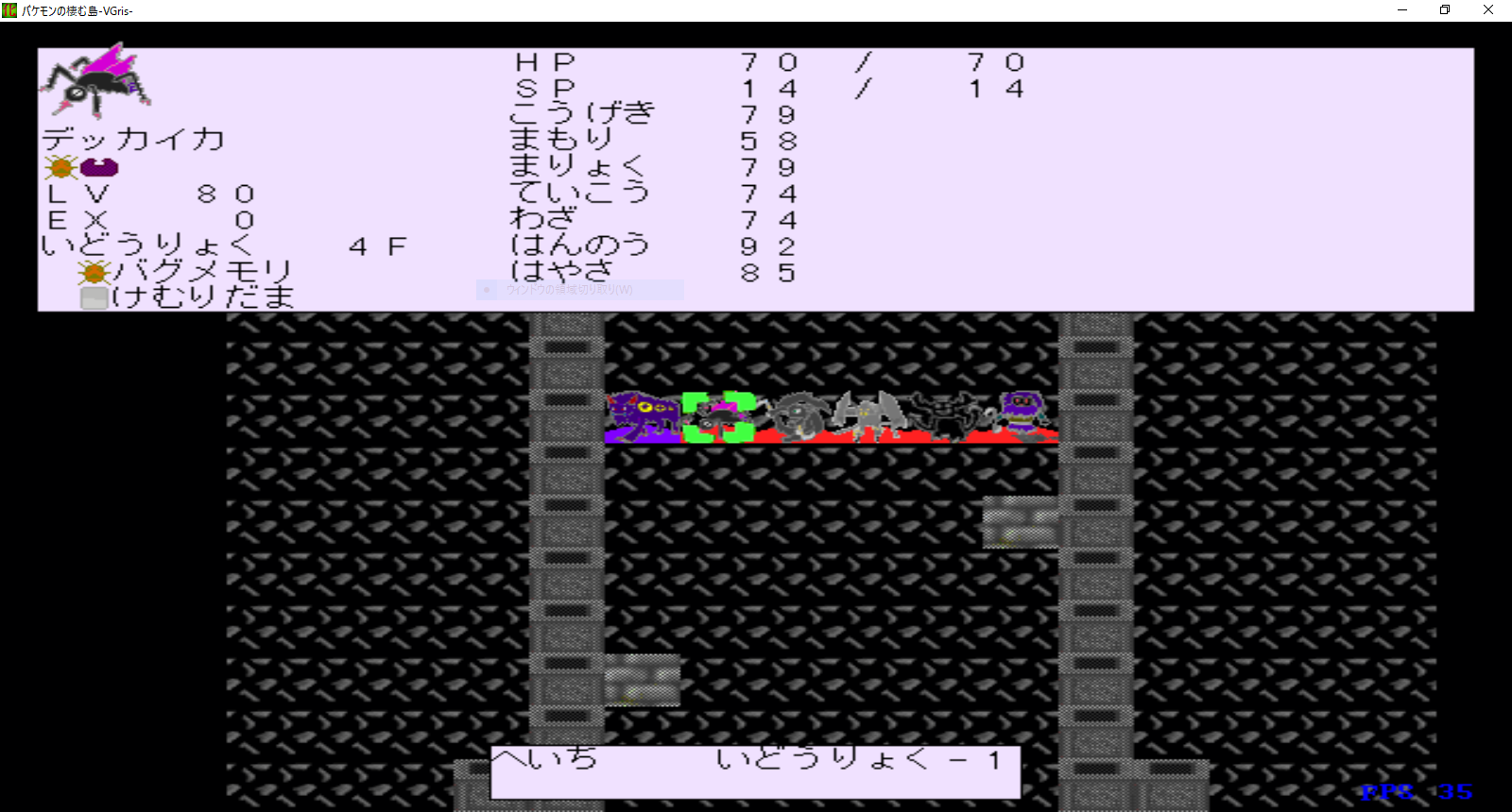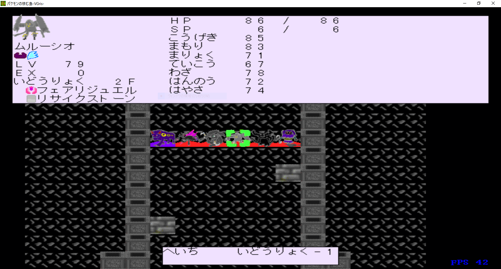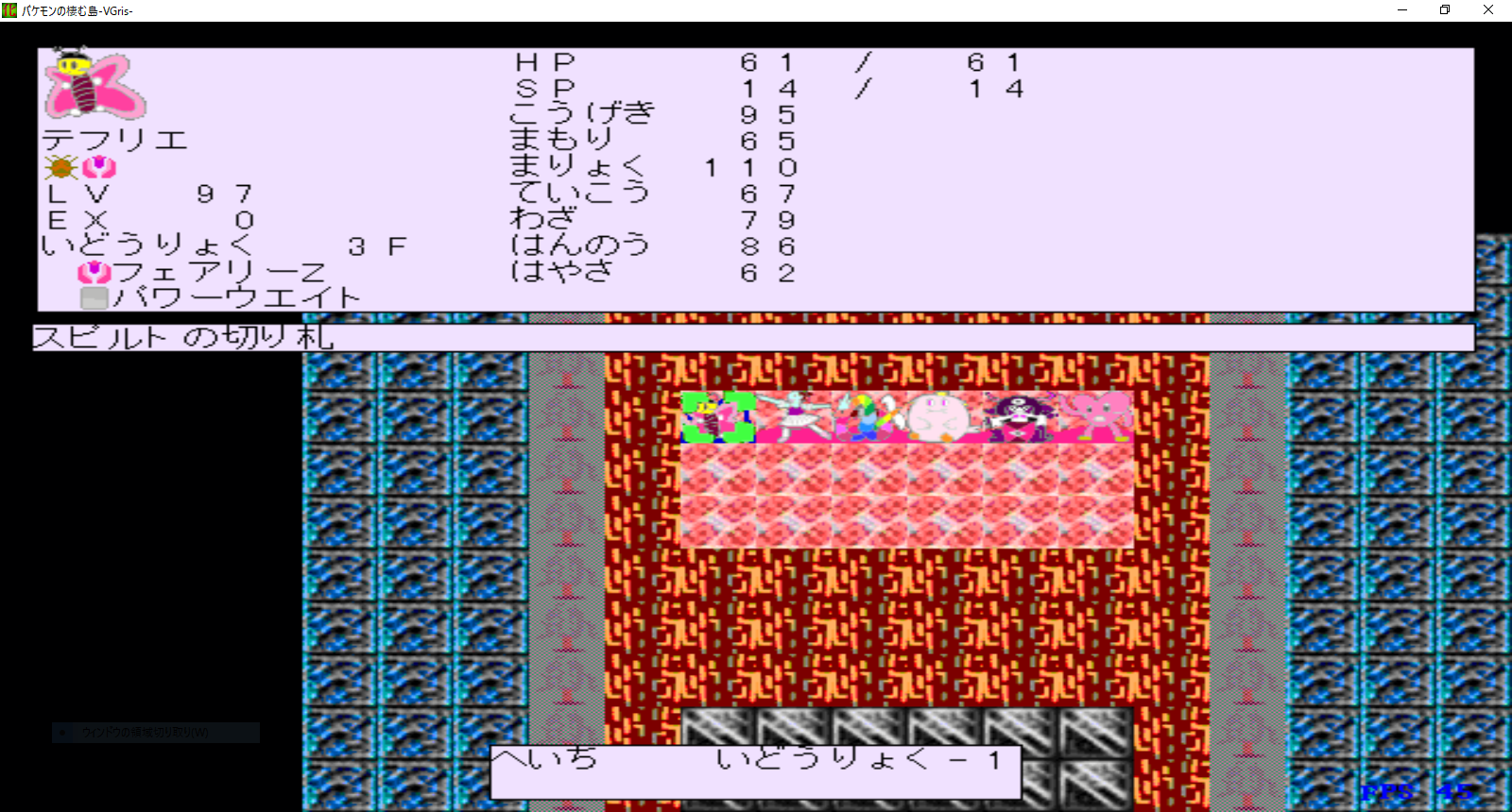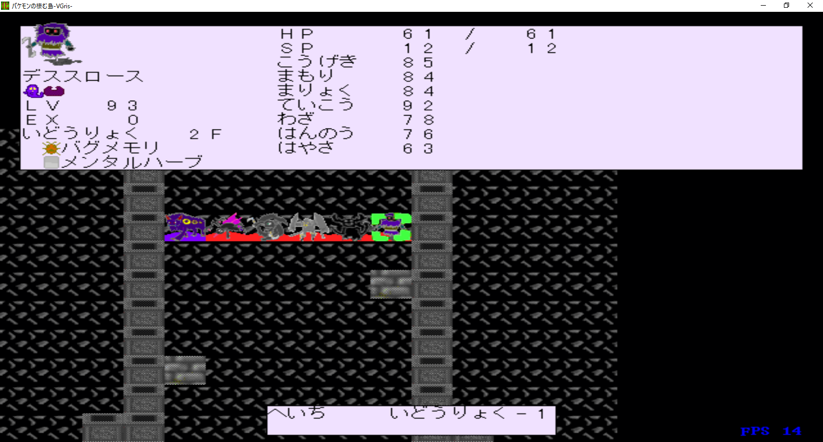 戦闘では、フィールド上で自軍バケモンが分断された状態で始まる上に、「床がダメージ床か回復床」という仕様のお陰で若干移動を強要される部分があります。