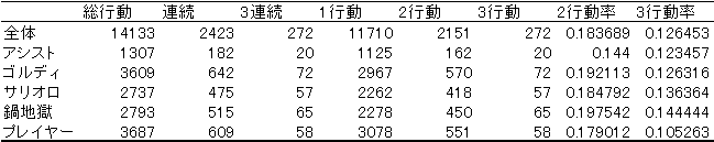 ちなみに結果全体では、15326回の行動発生中に、2613回の「連続行動発生!」と430回の「3連続行動発生!」が起きています。