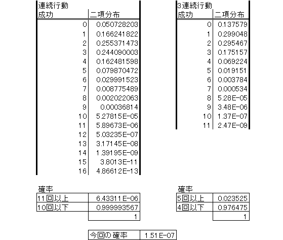 結果、今回のように11回の連続行動と5回の連続行動以上の結果が得られる確率は、大体0.0000151%と得られました。