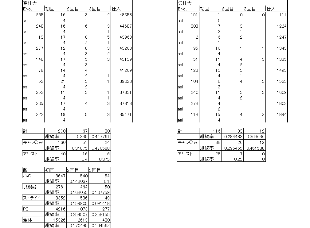 ・アシストとキャラ自体の連続率に若干の違いが見られる。(アシストが出る前に連続率が下がりきってる可能性もあり)