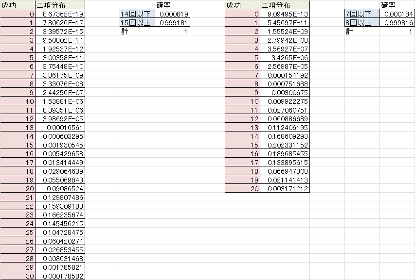 エクセルのBINOMDISTを使用した結果。