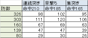 今回は、連続突きを命中210、早撃ちを命中185、隼突きを命中165としてそれに合わせて補正しましょう。